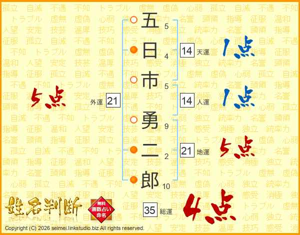 五(5画)日(4画)市(5画) 勇(9画)二(2画)郎(10画)