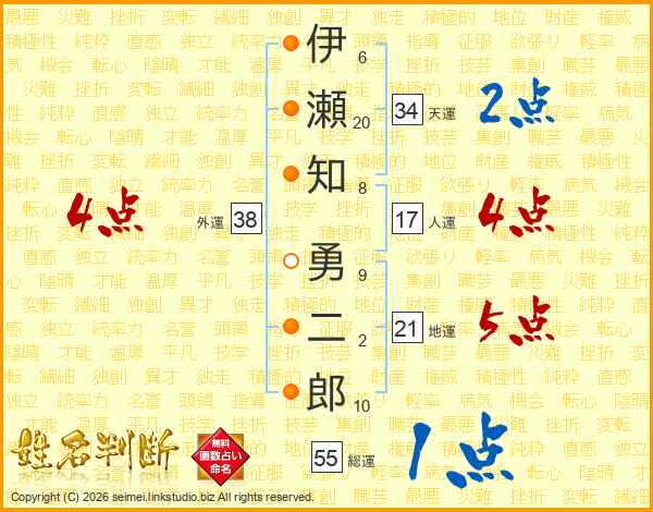 伊(6画)瀬(20画)知(8画) 勇(9画)二(2画)郎(10画)