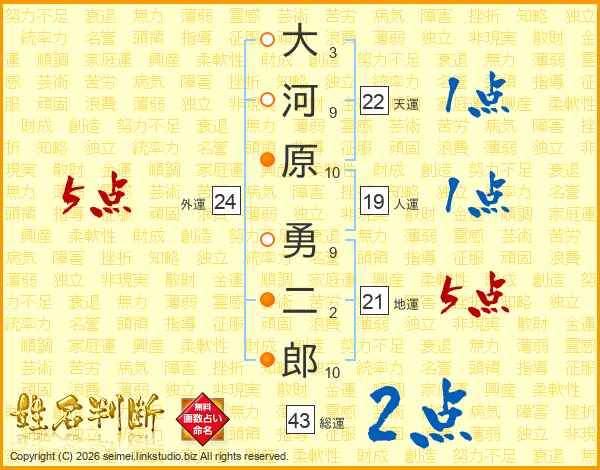 大(3画)河(9画)原(10画) 勇(9画)二(2画)郎(10画)