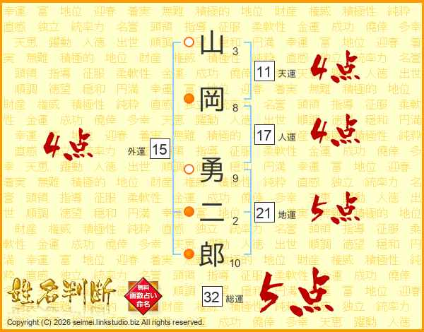 山岡勇二郎さんの総運は32画の5点!