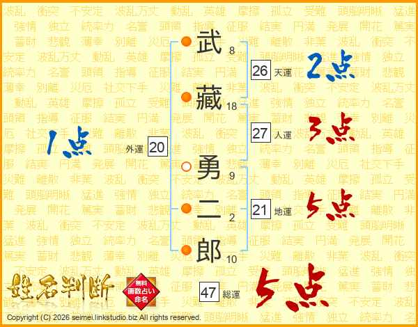 武(8画)藏(18画) 勇(9画)二(2画)郎(10画)