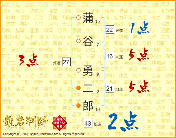 蒲谷勇二郎さんの地運は21画の5点!