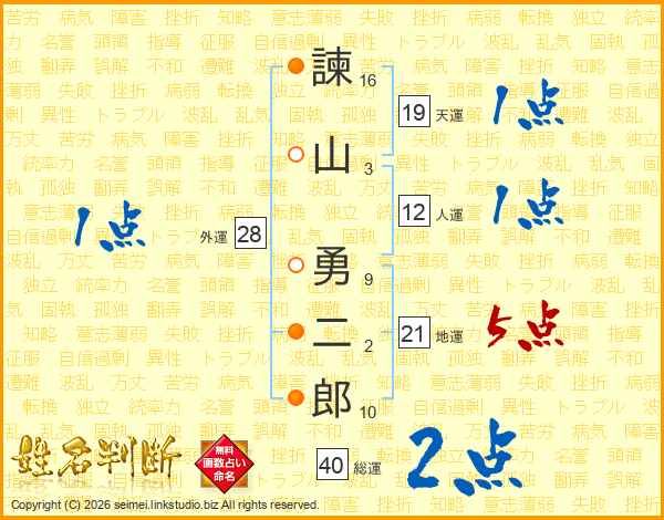 諫(16画)山(3画) 勇(9画)二(2画)郎(10画)