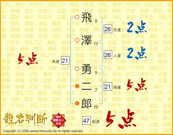 飛(9画)澤(17画) 勇(9画)二(2画)郎(10画)