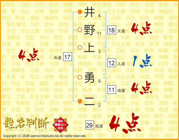 井(4画)野(11画)上(3画) 勇(9画)二(2画)