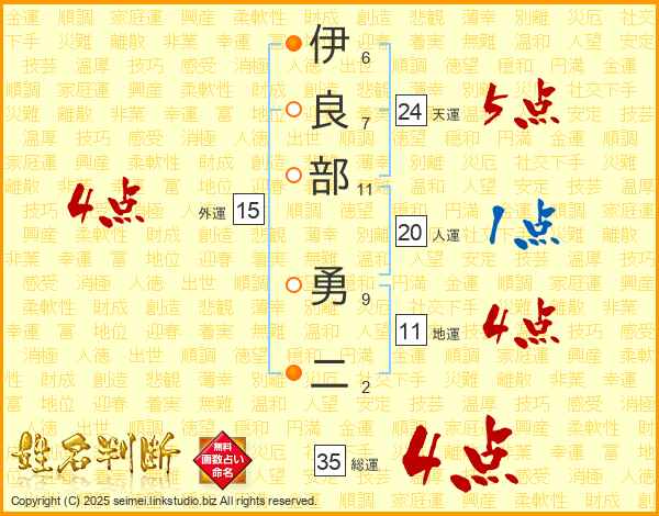 伊(6画)良(7画)部(11画) 勇(9画)二(2画)