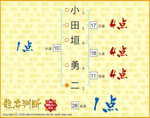 小(3画)田(5画)垣(9画) 勇(9画)二(2画)
