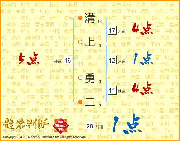 生活面を象徴する運勢です。外部から受ける影響力を表し、結婚運、家庭運や職場、環境への順応性を表します。総運から人運を引いた画数。姓や名が1文字の場合を除く。