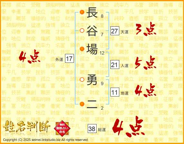 長(8画)谷(7画)場(12画) 勇(9画)二(2画)
