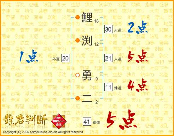 鯉(18画)渕(12画) 勇(9画)二(2画)