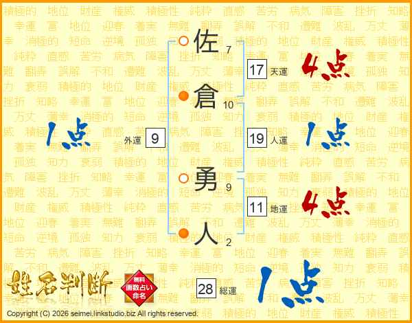 佐倉勇人さんの総運は28画の1点!