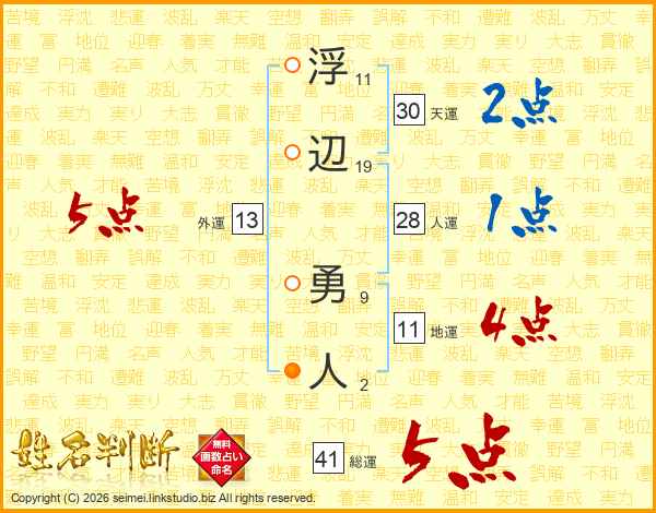浮(11画)辺(19画) 勇(9画)人(2画)