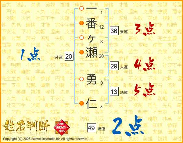 一番ヶ瀬勇仁さんの総運は49画の2点!