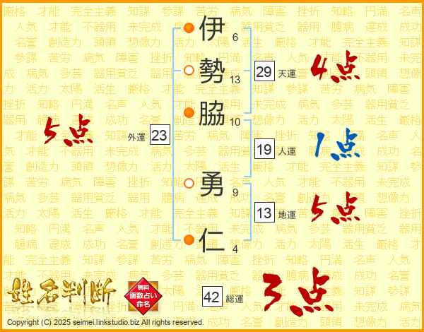 伊(6画)勢(13画)脇(10画) 勇(9画)仁(4画)