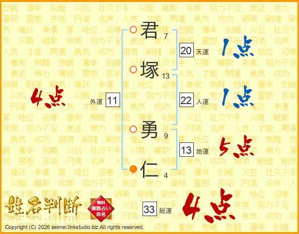 君(7画)塚(13画) 勇(9画)仁(4画)
