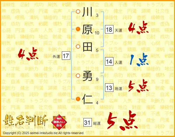 川(3画)原(10画)田(5画) 勇(9画)仁(4画)