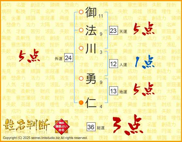 御(11画)法(9画)川(3画) 勇(9画)仁(4画)