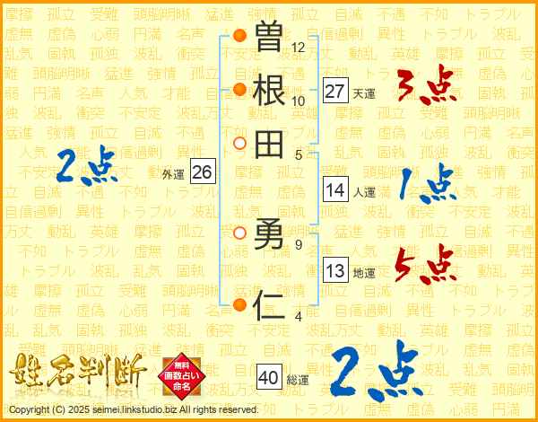 曽(12画)根(10画)田(5画) 勇(9画)仁(4画)