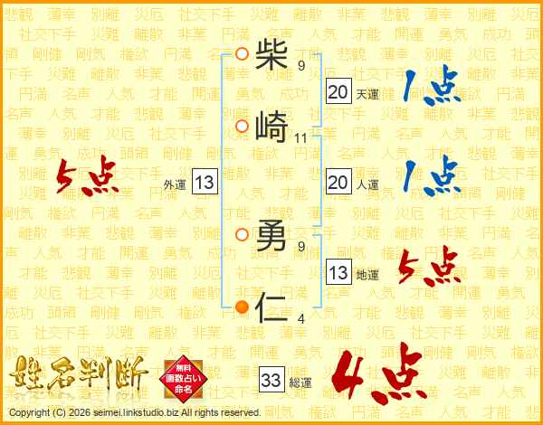 柴(9画)崎(11画) 勇(9画)仁(4画)