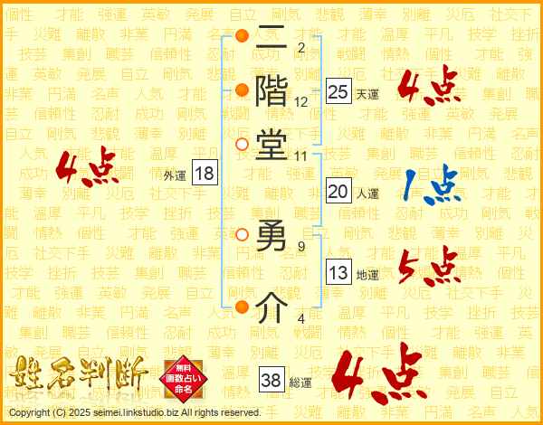 生活面を象徴する運勢です。外部から受ける影響力を表し、結婚運、家庭運や職場、環境への順応性を表します。総運から人運を引いた画数。姓や名が1文字の場合を除く。