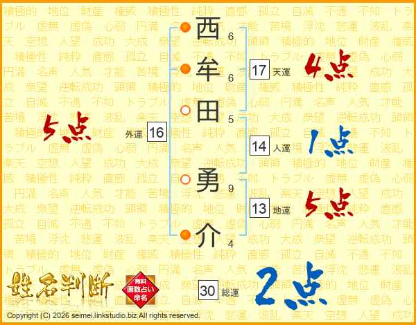 西(6画)牟(6画)田(5画) 勇(9画)介(4画)