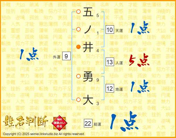 生活面を象徴する運勢です。外部から受ける影響力を表し、結婚運、家庭運や職場、環境への順応性を表します。総運から人運を引いた画数。姓や名が1文字の場合を除く。