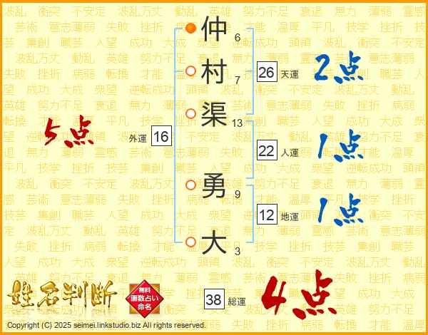 仲(6画)村(7画)渠(13画) 勇(9画)大(3画)