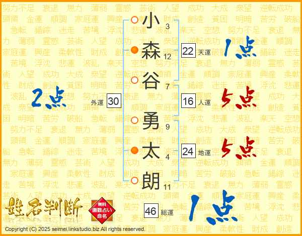 小(3画)森(12画)谷(7画) 勇(9画)太(4画)朗(11画)