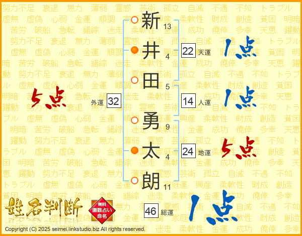 新(13画)井(4画)田(5画) 勇(9画)太(4画)朗(11画)