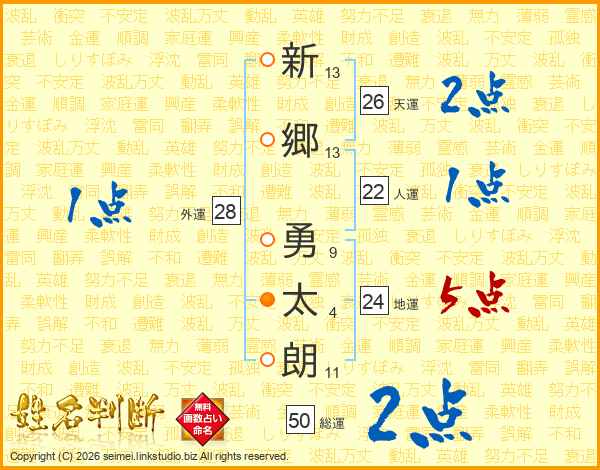 新(13画)郷(13画) 勇(9画)太(4画)朗(11画)