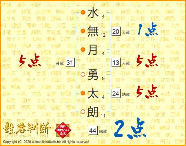 水(4画)無(12画)月(4画) 勇(9画)太(4画)朗(11画)