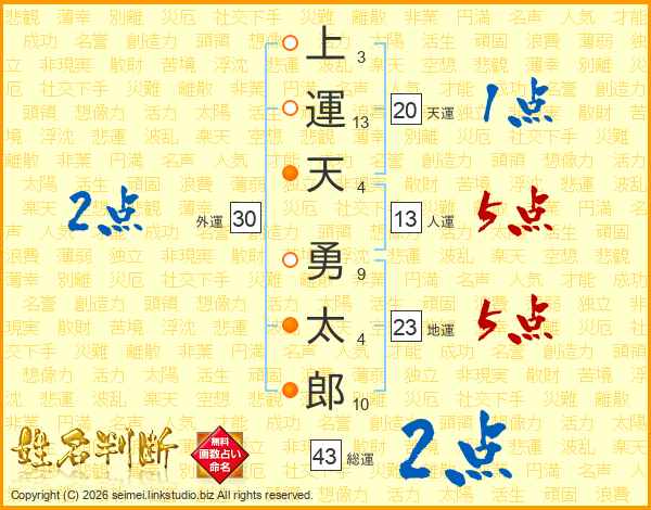 上(3画)運(13画)天(4画) 勇(9画)太(4画)郎(10画)