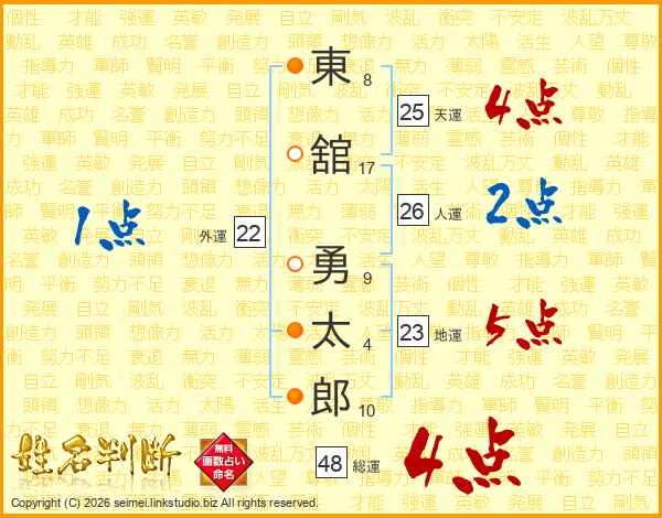 東(8画)舘(17画) 勇(9画)太(4画)郎(10画)