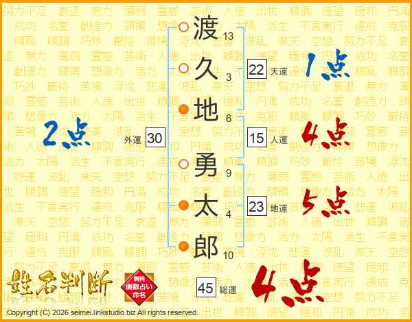 渡(13画)久(3画)地(6画) 勇(9画)太(4画)郎(10画)