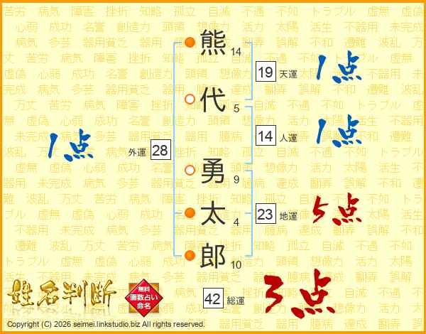 熊(14画)代(5画) 勇(9画)太(4画)郎(10画)
