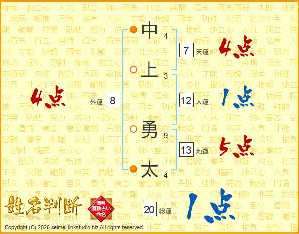 生活面を象徴する運勢です。外部から受ける影響力を表し、結婚運、家庭運や職場、環境への順応性を表します。総運から人運を引いた画数。姓や名が1文字の場合を除く。