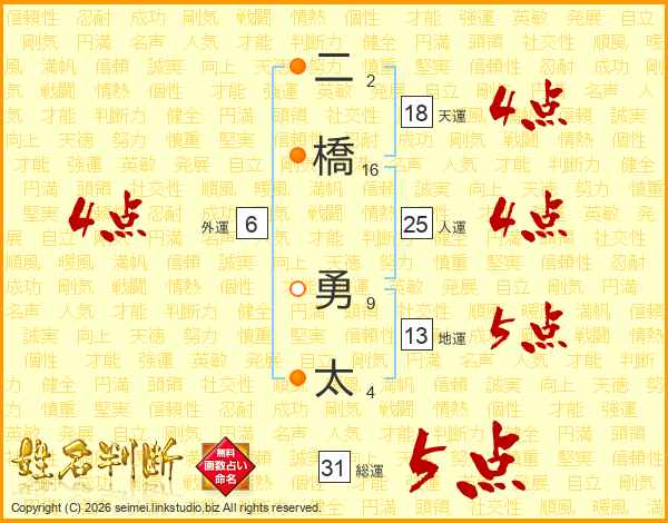 あなたの人生を表す1番重要な運勢です。生涯を通じて影響する総合運となり、主に50歳以降の晩年期に影響を及ぼします。苗字と名前の合計画数。