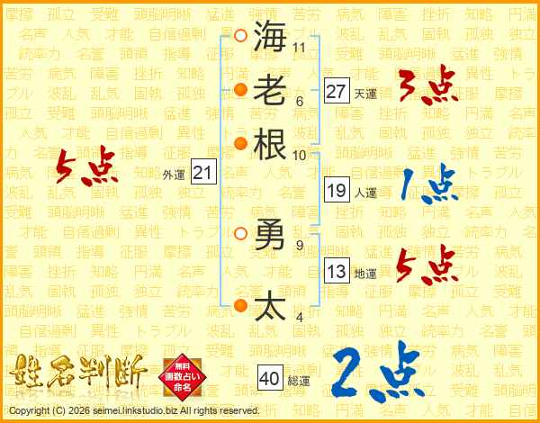 海(11画)老(6画)根(10画) 勇(9画)太(4画)