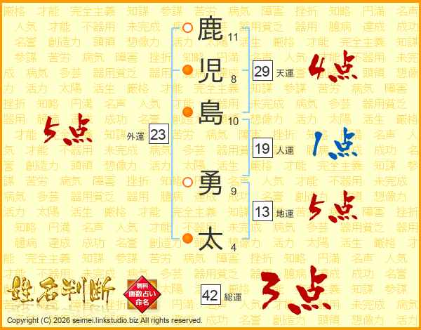 鹿児島勇太さんの天運は29画の4点!