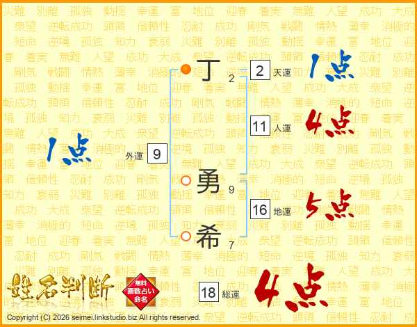 あなたの人生を表す1番重要な運勢です。生涯を通じて影響する総合運となり、主に50歳以降の晩年期に影響を及ぼします。苗字と名前の合計画数。