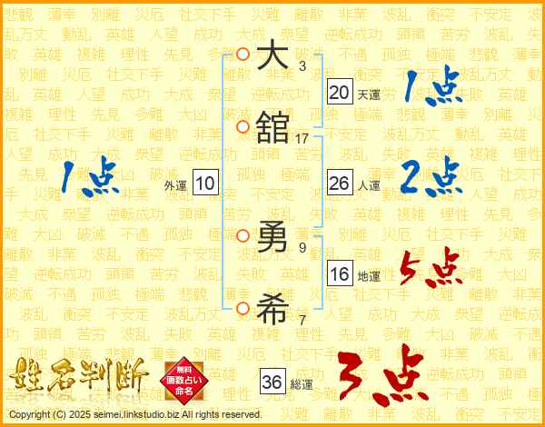 あなたの人生を表す1番重要な運勢です。生涯を通じて影響する総合運となり、主に50歳以降の晩年期に影響を及ぼします。苗字と名前の合計画数。