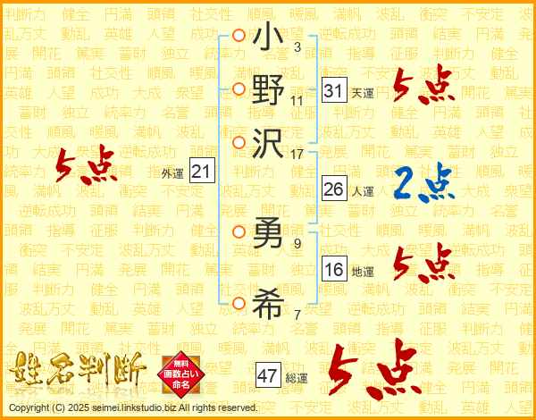 小(3画)野(11画)沢(17画) 勇(9画)希(7画)