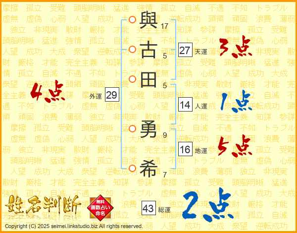與(17画)古(5画)田(5画) 勇(9画)希(7画)