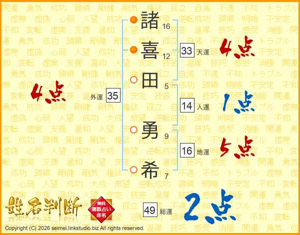 諸(16画)喜(12画)田(5画) 勇(9画)希(7画)