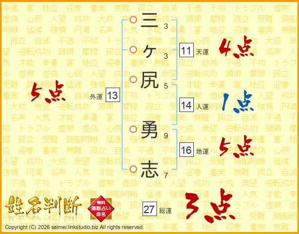三(3画)ヶ(3画)尻(5画) 勇(9画)志(7画)