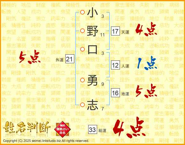 小(3画)野(11画)口(3画) 勇(9画)志(7画)