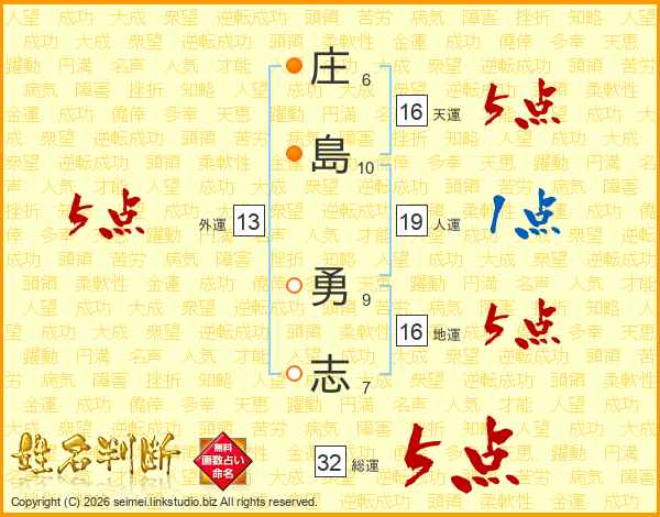 庄(6画)島(10画) 勇(9画)志(7画)