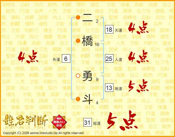 二橋勇斗さんの人運は25画の4点!