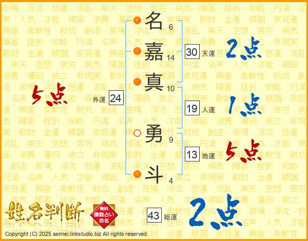 名(6画)嘉(14画)真(10画) 勇(9画)斗(4画)