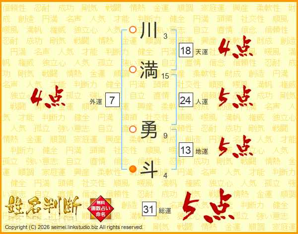 川(3画)満(15画) 勇(9画)斗(4画)